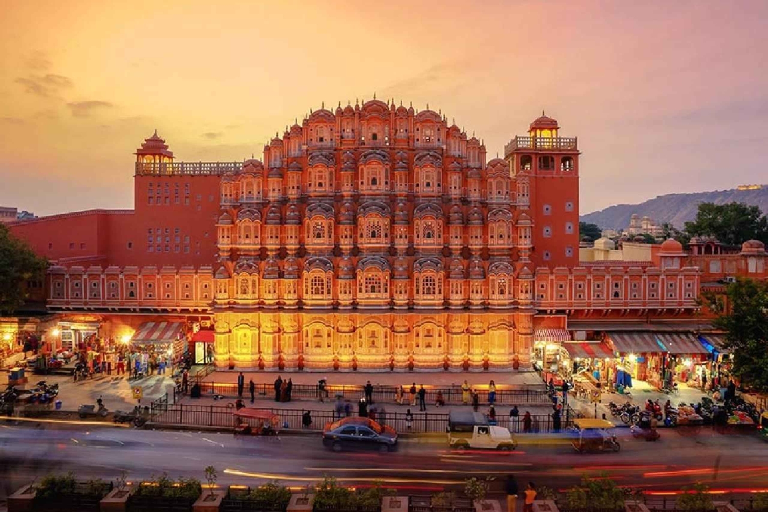 Jaipur: Scopri gli splendidi palazzi della Città Rosa, tra cui l'Hawa Mahal e l'Amber Fort, e fai acquisti di artigianato nei bazar locali.